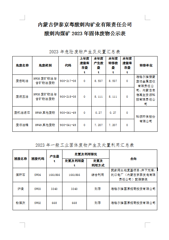 内蒙古伊泰京粤酸刺沟矿业有限责任公司 酸刺沟煤矿2023年固体废物公示表 <span>发布时间:2024-01-15</span> | <span class="views">关注:<b id="viewCountId">406</b></span> | <a href="javascript:void(0)" class="print"><i class="ion"></i></a> 返回列表 上一条 下一条