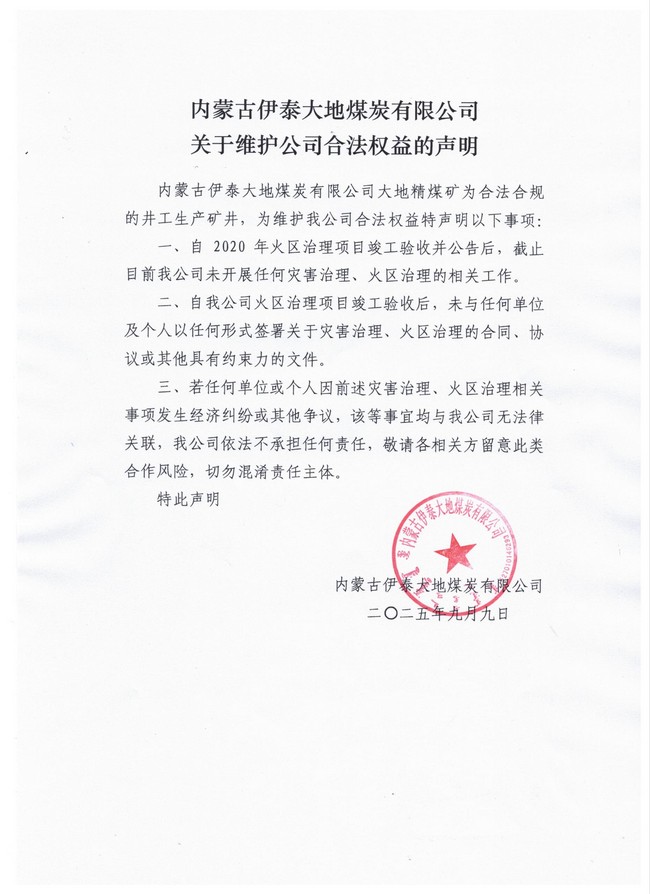 内蒙古伊泰大地煤炭有限公司 关于维护公司合法权益的声明