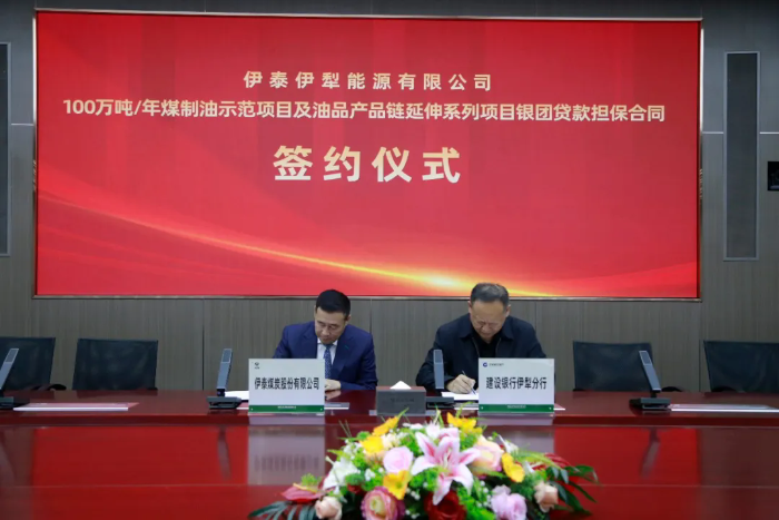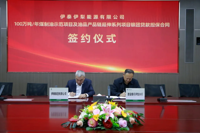 9月15日,伊犁能源公司100万吨/年煤制油示范项目及油品产品链延伸系列项目银团贷款担保合同签约仪式在集团公司举行。中国建设银行伊犁分行、中国进出口银行内蒙古分行、中国银行鄂尔多斯分行、招商银行鄂尔多斯分行、浦发银行内蒙古分行、兴业银行鄂尔多斯分行、中国民生银行鄂尔多斯分行、渤海银行呼和浩特分行代表出席仪式。伊泰集团公司党委书记、董事长、总裁刘春林,集团公司党委委员、董事、副总裁、股份公司董事长张晶泉,集团公司副总会计师杨建军,股份公司财务总监郝强胜等领导共同出席,集团公司总会计师靳荣主持仪式。